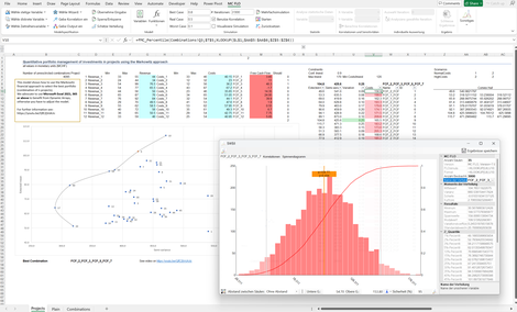 Portfolio Markowitz: Es sollen n Projekte mit unsicheren Ergebnissen in Bezug auf Wirkung und Aufwand (Kosten) so zusammengestellt werden, dass der Ertrag bei gleichzeitiger Minimierung der Volatilität maximiert wird. Dies unter Berücksichtigung, dass gewisse Projekte durchgeführt und "Guardrails" hinsichtlich der Investitionssumme eingehalten werden. Zudem sind Korrelationen abzubilden.
