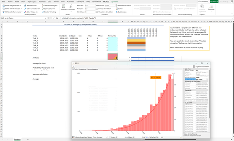 Ziel ist, dass das Projekt in 65 Tagen abschlossen sein soll. Anhand einer Simulation kann gezeigt werden, dass in nur von 11 von 100 Fällen dieses Ziel unterschritten wird.