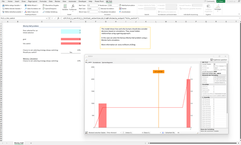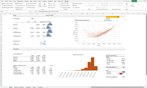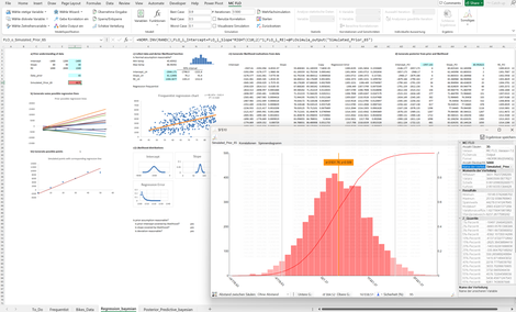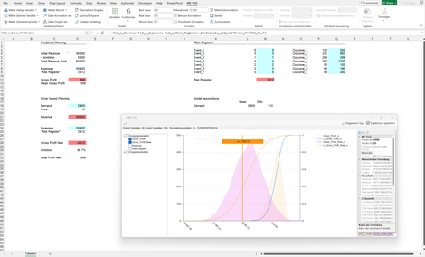 Sowohl die traditionelle Planung als auch das Risikoregister sind als Ereignisse unter Unsicherheit aufzufassen. Weder die Absatzmenge noch mögliche andere auf den Gewinn Einfluss nehmende Ereignisse sind "sicher". Unsichere Ereignisse sind mit Wahrscheinlichkeiten zu hinterlegen. Diese können rein subjektiv formuliert sein. Mit einer Simulation schaffen Sie Transparenz - ihre Entscheidungen werden bewusster. Info: Das Modell bildet Abhängigkeiten zwischen Variablen als