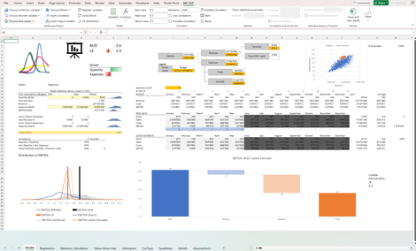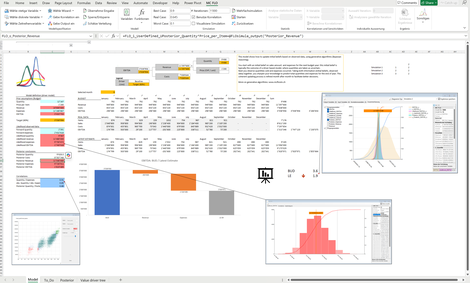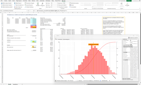 Latest Estimate: Zeigt auf, wie anhand von Daten ein Lernprozess stattfindet. Ausgangslage sind Annahmen über die Zielvariable (etwa EBITDA), welcher sich aus den unsicheren Annahmen zu Umsätzen, Aufwand und möglichen Korrelationen zusammensetzt. Das Ergebnis hiervon aus einer Monte-Carlo Simulation entspricht dem Vorwissen (Prior).