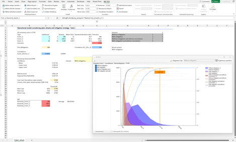 Sowohl vor als nach Beobachtung von Daten kann der Einfluss der Treibervariablen auf das Ergebnis anhand einer Risiko-Matrix dargestellt werden. Während vor Beobachtung die Cyber-Attacken als wesentlicher Treiber des Ergebnis klassifiziert werden können, kann nach Beobachtung eine Entwarnung ausgesprochen werden.