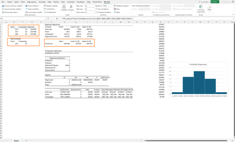 Im Folgenden haben wir ein Modell mit zwei erklärenden Variablen (Items, Campaigns) und drei beobachteten Datensätzen. Falls im nächsten Monat 223 Items abgesetzt und 15 Compaigns lanciert werden sollen, welcher Umsatz ist im Erwartungswert und unter Einschluss des 95%-glaubhaften Intervalls zu erwarten?